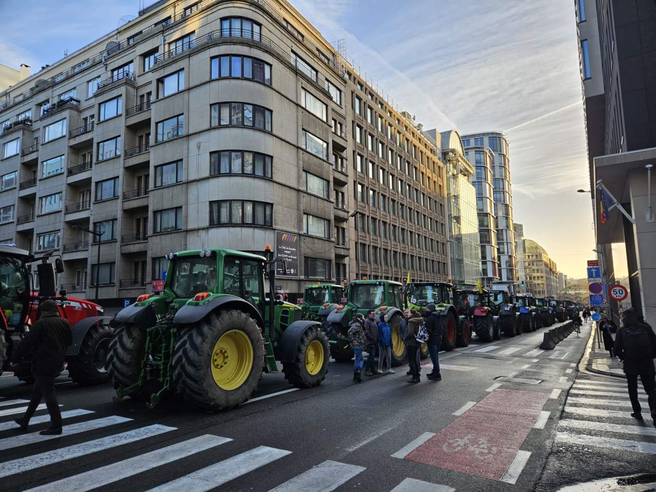 Trattori sfilano nel centro di Bruxelles per protestare contro le politiche agricole dell'Ue (febbraio 2024)