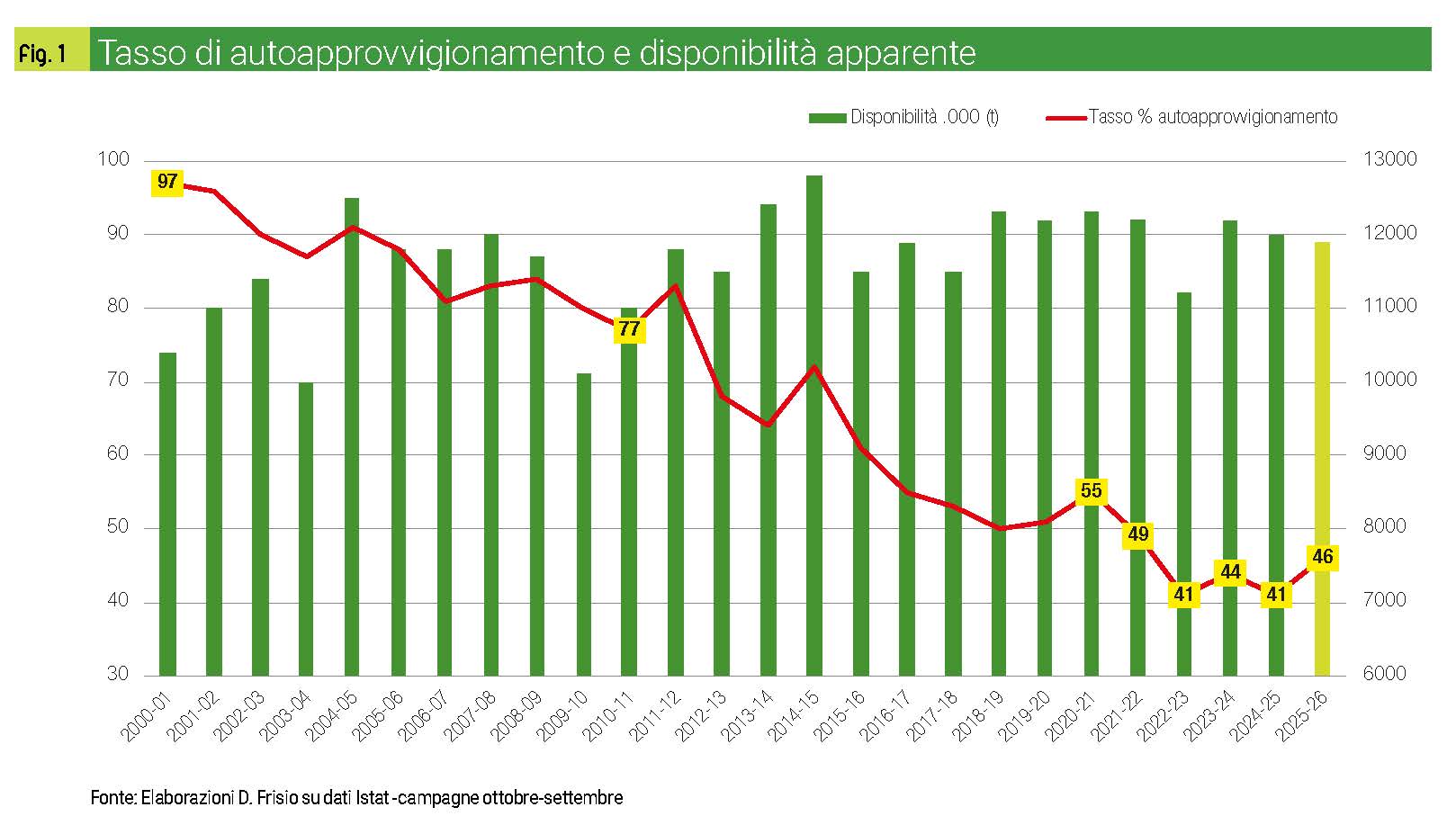 Allo stesso tempo si conferma lo stato di sofferenza del comparto, perché la produzione raccolta è sì risalita da 4,9 a 5,5 milioni di tonnellate (+12%), ma è rimasta largamente insufficiente, coprendo appena il 45% del fabbisogno nazionale. Nell’annata 2024/25, il deficit della bilancia commerciale (importazioni superiori alle esportazioni) ha raggiunto il record di 7,1 milioni di tonnellate (+3%). Questo ha portato a un costo netto di quasi 1,6 miliardi di euro (+9%), aggravato da prezzi medi d’importazione in aumento del 6% (fig. 1).