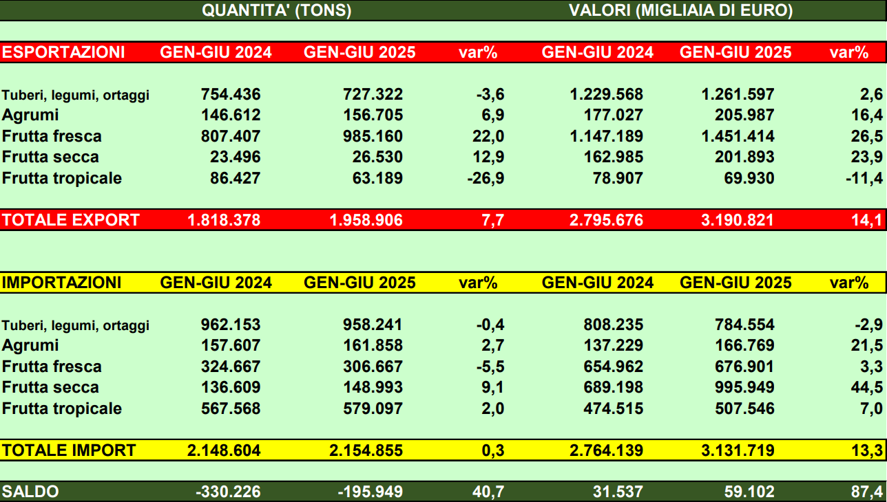 Un'altra buona notizia per il settore ortofrutticolo italiano. Dopo i dati sull'aumento dei consumi diffusi di recente dal Cso, altri numeri incoraggianti arrivano dalle esportazioni. Nel primo semestre del 2025 sono cresciute del 7,7% in volume e del 14,1% in valore rispetto allo stesso periodo del 2024. È quanto emerge dai dati elaborati da Fruitimprese su base Istat. In risalita anche il saldo della bilancia commerciale che, nonostante la crescita delle importazioni (+0,3% in quantità e +13,3% in valore), ammonta a 59,102 milioni euro, +87,4% rispetto all'anno precedente. A migliorare anche il saldo in volume (+40,7%) con l'import che però supera ancora l'export di 195.949 tonnellate.