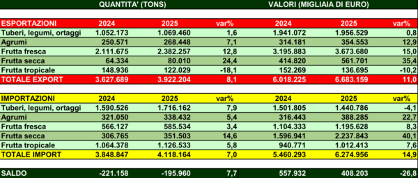 Nuovo primato per le esportazioni italiane di ortofrutta fresca. Nel 2025 il valore è stato di sei miliardi e 683 milioni di euro (+11% sul 2024), mentre i volumi hanno sfiorato i quattro milioni di tonnellate (3.922.204) in aumento dell’8,1% rispetto all’anno precedente. Cresciute anche le importazioni (+14,9% in valore e +7% in volume), tanto che il saldo commerciale è stato di 408,2 milioni di euro, in calo del 26,8% rispetto al 2024. Negativo anche il saldo in volume (-195.960 t) in leggero recupero (+7,7%) rispetto ai dodici mesi precedenti. Queste le cifre comunicate da Fruitimprese basandosi su dati dell'Istat.