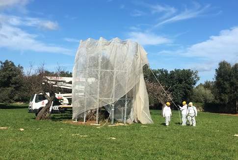 Xylella: incappucciato l’olivo infetto a Monopoli (Ba). Ma i Carabinieri forestali inaspettatamente impongono l’apertura della rete in sommità