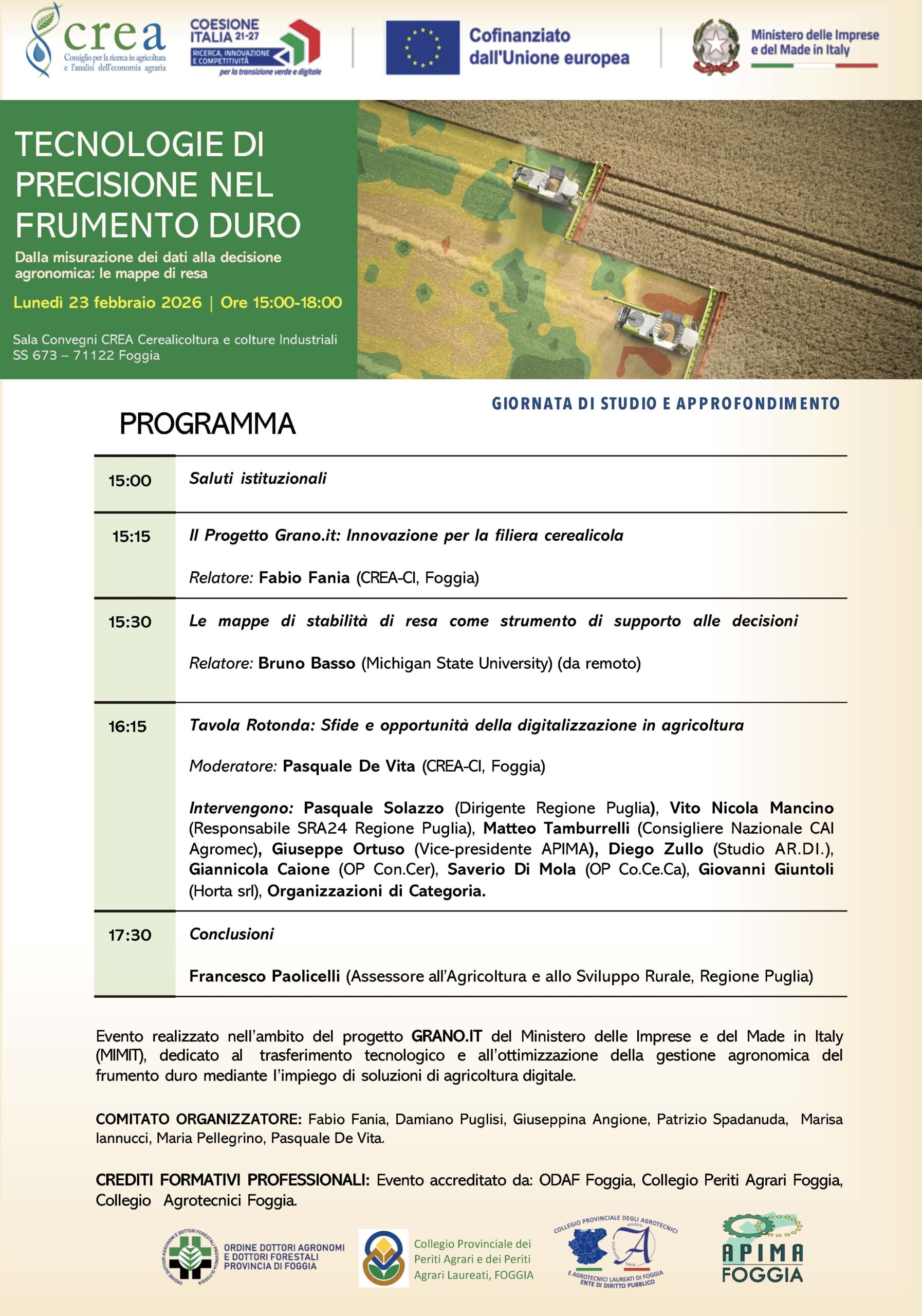 Lunedì 23 febbraio 2026, presso la sede di CREA Cerealicoltura e Colture Industriali di Foggia, si terrà una giornata di studio dedicata alle tecnologie di precisione applicate al frumento duro, con un focus specifico sull’utilizzo delle mappe di resa come strumento operativo per la gestione agronomica.