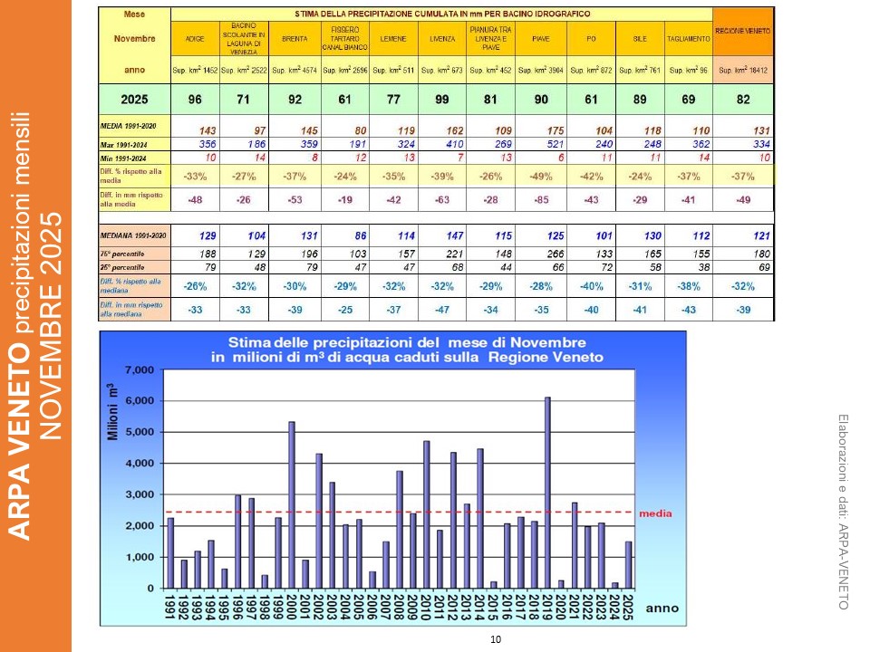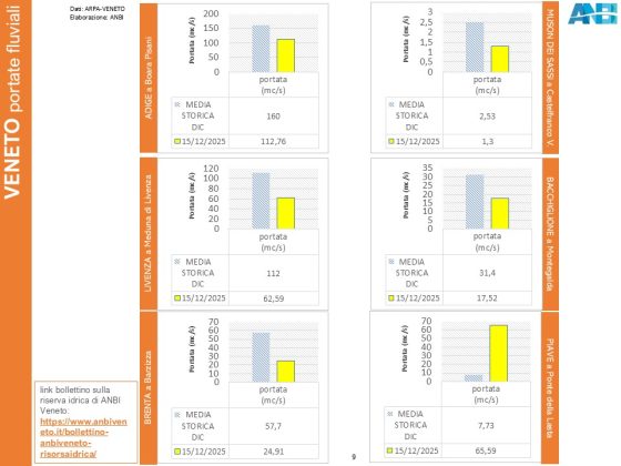 In Veneto, ad aumentare significativamente sono i flussi del fiume Piave, mentre Muson dei Sassi ed Adige registrano una sostanziale invarianza; Livenza, Bacchiglione, Brenta hanno invece andamento idrometrico negativo e portate molto al di sotto della media (rispettivamente -44%, -44% e -57%).