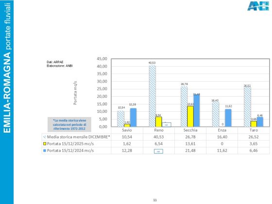 In Emilia-Romagna le portate dei fiumi continuano a ridursi con il Taro, che è sceso fino al 14% della portata media del periodo, il Reno al 16%, Santerno ed Enza al di sotto dei valori minimi storici (fonte ARPAE).