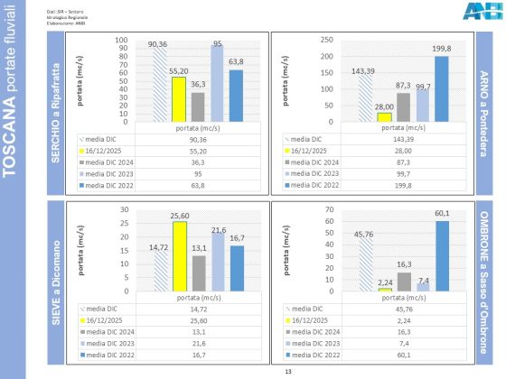 In Toscana sono stabili le portate dei fiumi Serchio e Sieve, mentre a calare sono i livelli dell’Arno, nel cui alveo scorre solamente il 20% dell’acqua, normalmente presente in questo periodo; in calo è anche l’Ombrone.