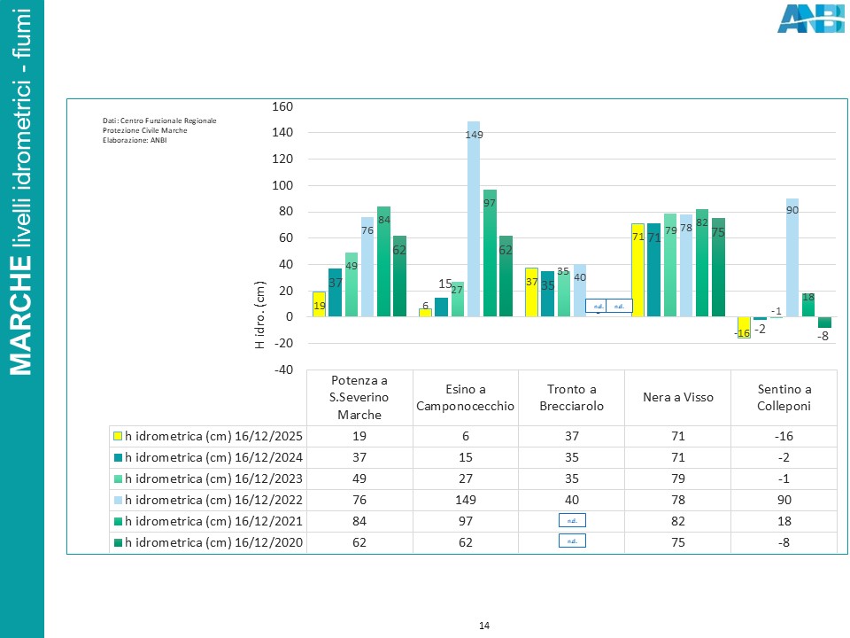 Nelle Marche, segno negativo per i fiumi Potenza, Esino e Sentino, i cui livelli idrometrici sono i più bassi del recente quinquennio.
