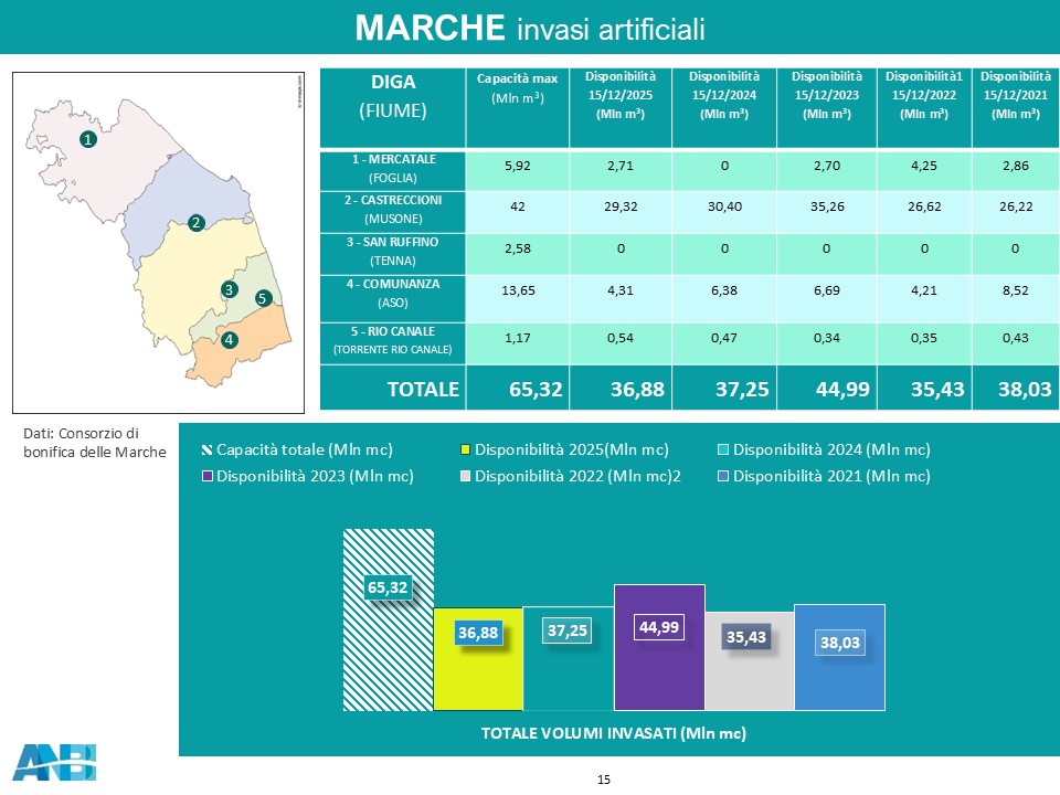 Vediamo in dettaglio la situazione regionale riportata nell'Osservatorio Anbi sulle Risorse Idriche del 18 dicembre 2025.