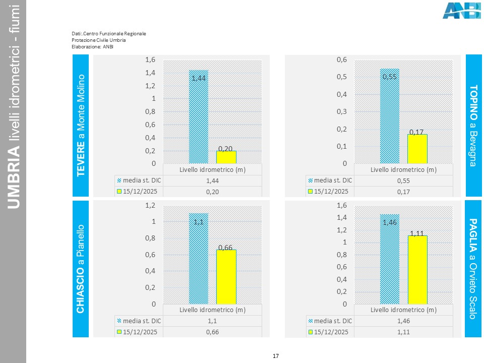 In Umbria la già ridotta altezza del lago Trasimeno perde un ulteriore centimetro; a crescere sono però le portate fluviali di Paglia e Chiascio.