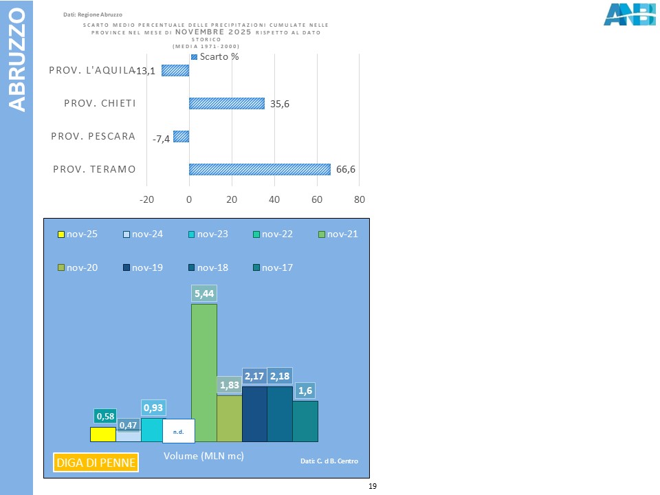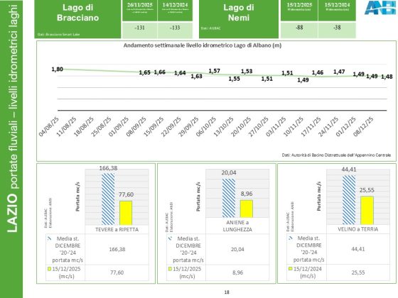 Nel Lazio tornano purtroppo a riabbassarsi i livelli idrometrici dei laghi romani, sempre più sofferenti e per i quali si attendono, così come per il Trasimeno, misure straordinarie, che ne rallentino l’ormai decennale declino: in un solo anno il bacino di Albano si è abbassato di ben 61 centimetri, mentre il calo nell’invaso di Nemi è quantificabile in mezzo metro. Scarse sono le portate dei fiumi Tevere (-53% sulla media dello scorso quinquennio), Aniene (-55%) e Velino (42%).
