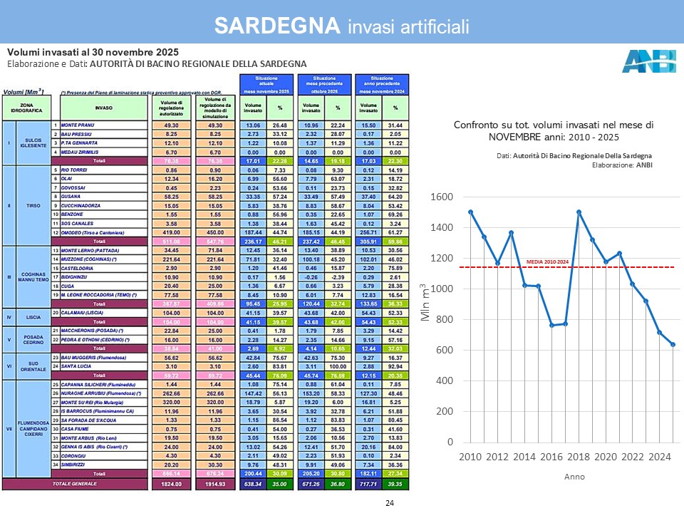 Se sulle Alpi la crisi climatica con l’innalzamento delle temperature sta provocando lo scioglimento dei ghiacciai, in Sardegna dopo due anni di siccità sta causando l’esaurimento dei bacini. Le foto realizzate dal satellite Copernicus Sentinel-2, evidenziano la gravità della situazione idrica, che continua ad attanagliare molti territori italiani. Emblematico è il progressivo prosciugamento del lago Omodeo, il più importante serbatoio sardo ed il più grande bacino artificiale d’Europa, autorizzato a contenere quasi 420 milioni di metri cubi d’acqua, ma che ora dopo la generalmente piovosa stagione autunnale ne trattiene solo poco più di 187 (il 44%), perdendo in soli 12 mesi un volume idrico pari a 69,27 milioni di m³ e addirittura 161,6 milioni di m³ rispetto al 2023.