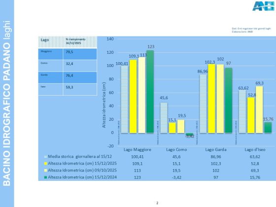 Tornando al nostro Paese, in leggera ripresa sono i livelli dei grandi laghi dell’Italia settentrionale (fatta eccezione per quello d’Iseo in forte calo): Verbano al 81,5% di riempimento, Lario al 34,1%, Benaco al 78,6%, Sebino al 57,1%.
