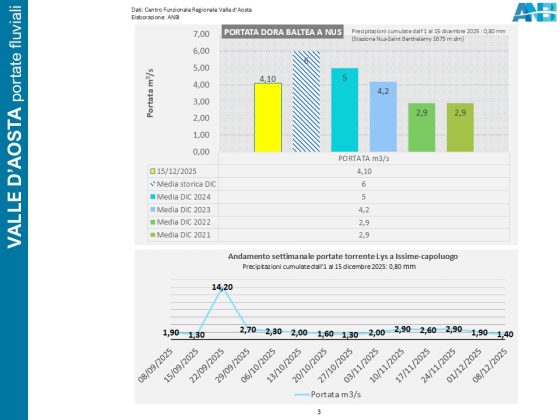 In Valle d’Aosta si riducono le altezze idrometriche di Dora Baltea e torrente Lys; fatta eccezione per un paio di stazioni nivometriche sopra i 2500 metri s.l.m., il manto nevoso al suolo, anche sopra i 2000 m, è inferiore al metro.