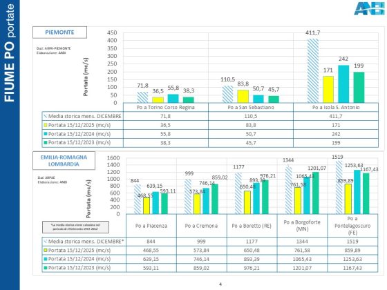 Lungo l’intera asta, la portata del fiume Po risulta fortemente deficitaria ed inferiore rispetto anche allo scorso biennio: ad Isola S. Antonio, nell’Alessandrino, i flussi sono di circa il 48% sotto alla media, a Pontelagoscuro il deficit è del 43%.