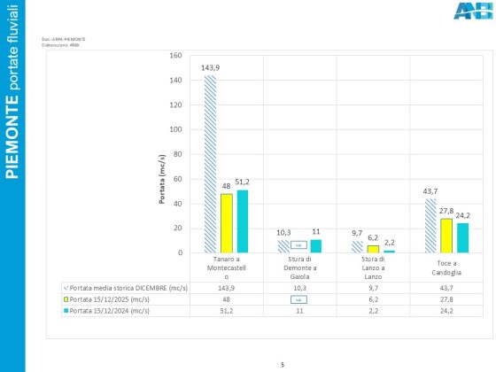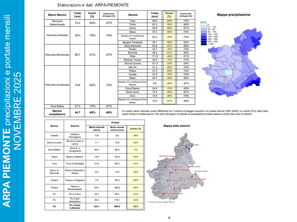 In Piemonte, nell’alveo del fiume Tanaro, scorre solo il 33% dell’acqua rispetto alla media e scarsi sono anche i flussi nella Toce e nella Stura di Lanzo.