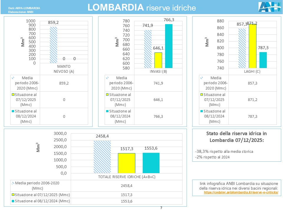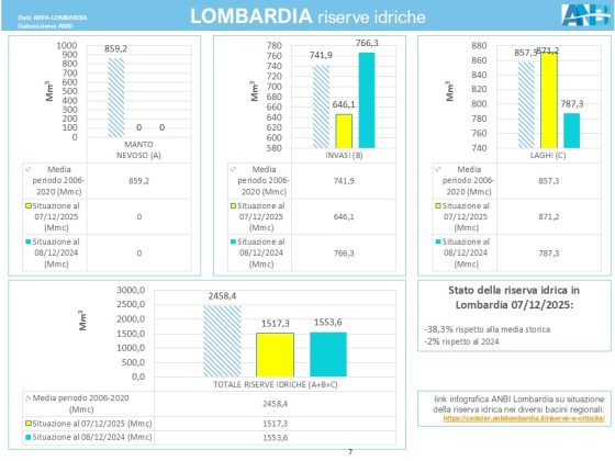 In Lombardia, le riserve idriche ammontano a 1517 milioni di metri cubi: un valore simile a quello dello scorso anno (-2%), ma di molto inferiore alla media storica (-38,3%): ad influenzare questo dato è soprattutto l’apporto nivale, che è ad oggi è praticamente nullo, quando invece mediamente in questo periodo dovrebbe registrarsi un indice SWE (Snow Water Equivalent) pari mln. mc. 859,3 (fonte: ARPA Lombardia).