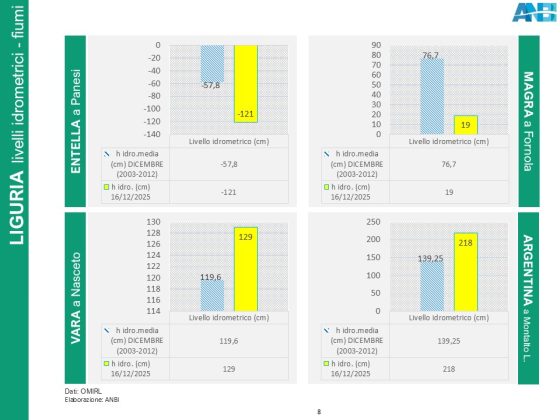 In Liguria, le piogge hanno fatto alzare il livello del fiume Argentina, che rispetto alla scorsa settimana è maggiore di quasi 80 centimetri; in crescita è anche l’Entella, mentre resta stabile la Vara e cala la Magra.