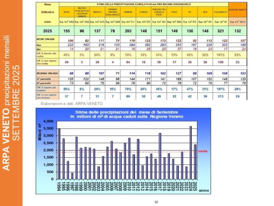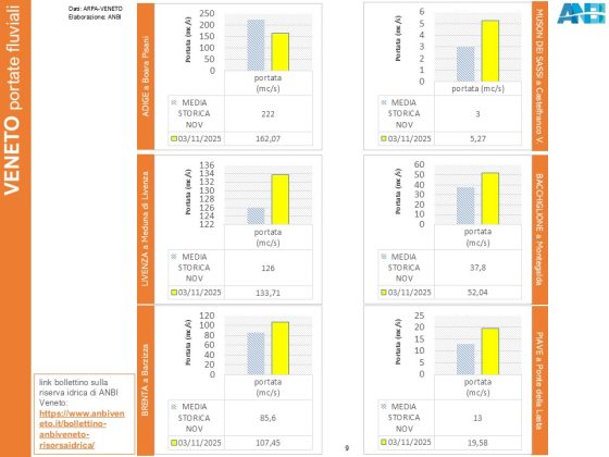 Anche in Veneto, i fiumi sono in crescita e le portate sovrabbondanti rispetto alla media mensile (Brenta +26%; Bacchiglione +38%; Muson dei Sassi +76%); fa eccezione l’Adige, i cui flussi sono più scarsi della media (-27%).