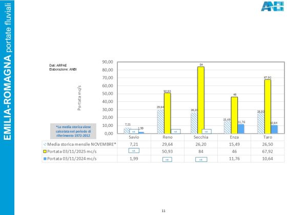 Settimana piovosa anche sull’Emilia-Romagna, dove le precipitazioni hanno rinvigorito le portate dei fiumi appenninici, che sono tornati a crescere al di sopra dei valori medi del periodo (Taro +156%, Enza +197%, Secchia +221%, Reno +72%).