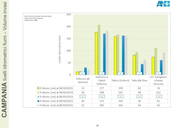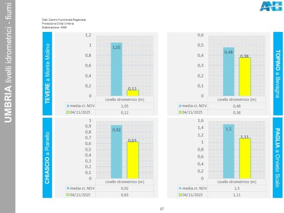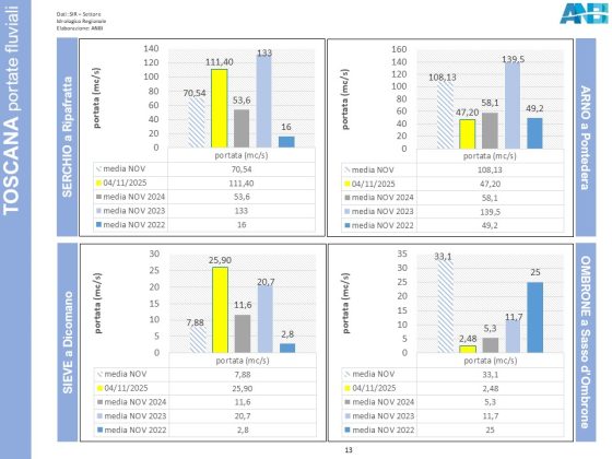In Umbria, le portate dei fiumi sono stabili ma più scarse del normale, mentre viene registrata una crescita di cm. 6 nell’altezza idrometrica del lago Trasimeno; la diga Arezzo trattiene ancora 1.550.000 metri cubi d’acqua.