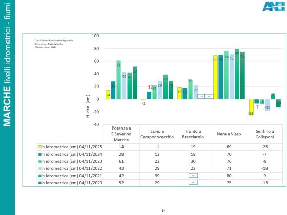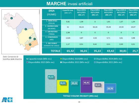 Livelli idrometrici dei fiumi tra i più bassi dell’ultimo decennio vengono registrati anche nelle Marche, dove però gli invasi mantengono volumi d’acqua piuttosto elevati per il periodo (il bacino di Castreccioni conserva indicativamente la stessa quantità d’acqua dell’anno scorso, cioè poco più di 30 milioni di metri cubi).