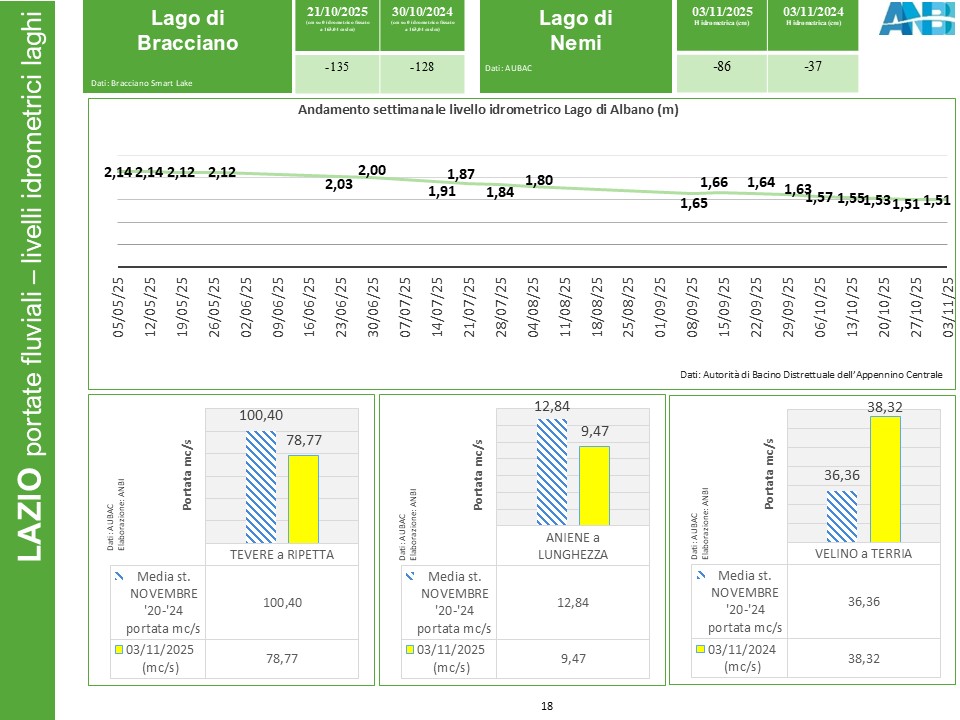 Tornando sulla Penisola, nel Lazio vanno segnalati, oltre alla conclamata crisi idrica dei laghi ai Castelli Romani, gli scarsi flussi in alveo del fiume Tevere, la cui portata si aggira su m3/s 79, quando normalmente, in base alle rilevazioni del recente quinquennio, dovrebbe attestarsi intorno ai 100 metri cubi al secondo (elaborazione ANBI su dati AUBAC); stabile, seppur anch’esso deficitario, l’Aniene mentre in Alta Sabina cresce il Velino.