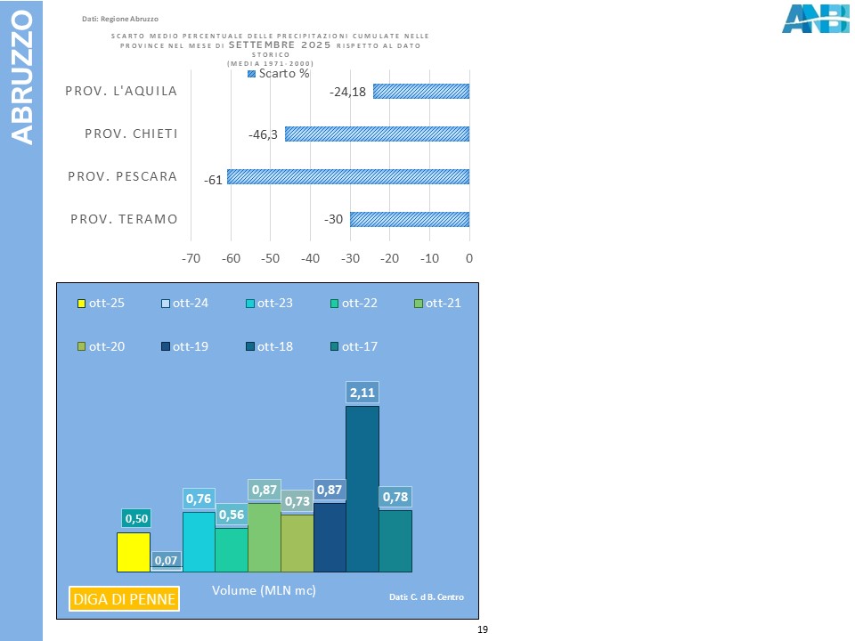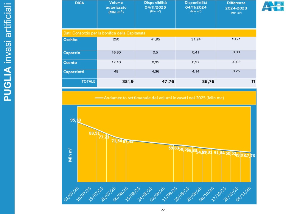 Sono le stesse preoccupazioni, che sta vivendo la Puglia e in particolare la provincia di Foggia, dove nonostante i rilasci idrici centellinati, i bacini si stanno inesorabilmente svuotando; a meno di provvidenziali precipitazioni, l’invaso di Occhito toccherà il volume morto nella prossima settimana (mancano solo 1.792.000 m3) con conseguente stop ai prelievi, se non a fini emergenziali. Sulla regione, Ottobre è stato particolarmente generoso in termini di precipitazioni cumulate, ma i territori con precipitazioni scarse sono state la costa ionica salentina e proprio la Capitanata, dove gli accumuli si sono aggirati sui 60 millimetri e l’auspicata ripresa dei livelli degli acquiferi è stata nuovamente disattesa.