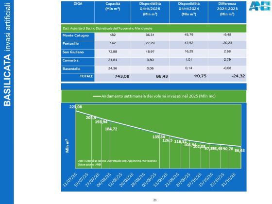 La drammaticità della peggiore situazione idrica di sempre in Basilicata è ben rappresentata dai numeri: -24 milioni di metri cubi d’acqua rispetto al 2024 nei bacini, dove i volumi rimanenti sono 86,43 mln m3; le più grandi dighe della regione (monte Cotugno e Pertusillo) trattengono complessivamente 63,6 mln m3, quando il solo serbatoio di monte Cotugno ha una capacità di 272 mln m3! Senza un netto cambio di tendenza meteorologico nei prossimi mesi, è facile immaginare altre stagioni difficili per gli agricoltori lucani.