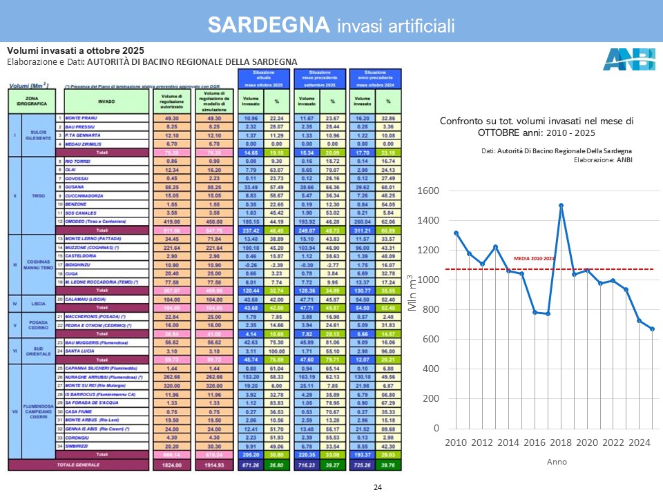 In Sardegna, i bacini trattengono solo il 37% dell’acqua invasabile ed il deficit sul 2024 è di ben 54 milioni di metri cubi. I volumi attualmente trattenuti nei serbatoi sono i più scarsi da almeno 15 anni: a Nord-Ovest, nella Nurra, mancano all’appello oltre 100 milioni di metri cubi d’acqua e quella, che rimane, costituisce appena il 5,88% dei volumi d’invaso autorizzati; è crisi anche nell’Alto Cixerri (i bacini sono al 7,27% dell’invasabile) e nel sistema idrico di Posada (il bacino Maccheronis trattiene soltanto il 7,85% del volume autorizzato). Positivo è invece il bilancio idrico nell’Ogliastra (invasi al 76,59% di riempimento) e nell’Alto Taloro (61,69%).