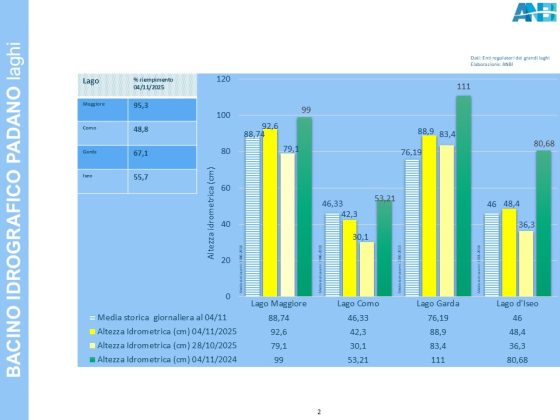 Anche nel resto del Nord sono positive le prestazioni settimanali, registrate dai corpi idrici superficiali: i grandi laghi hanno livelli in crescita e maggiori delle medie storiche, ad eccezione del bacino di Como (Verbano al 94% di riempimento, Verbano al 48,8%, Benaco al 66,4%, Sebino al 57,9%).