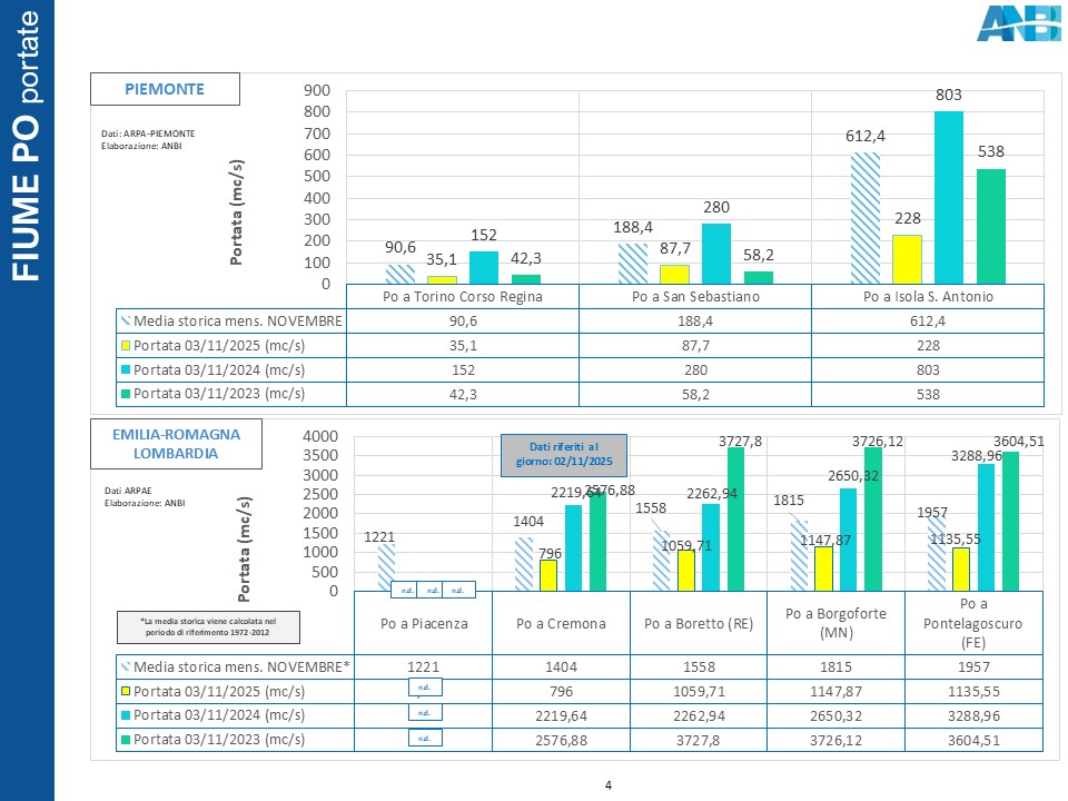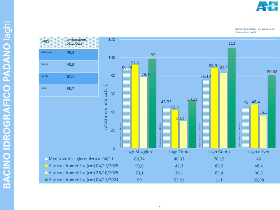 Vediamo in dettaglio la situazione regionale riportata nell'Osservatorio Anbi sulle Risorse Idriche del 4 novembre 2025.