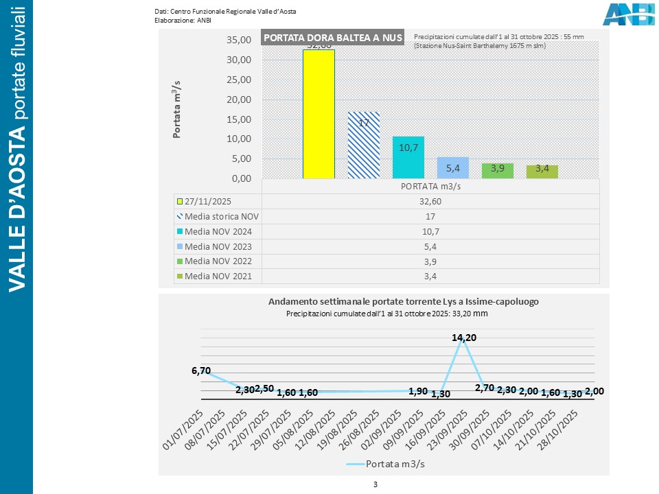 In Valle d’Aosta è in crescita la portata della Dora Baltea, che attualmente supera di quasi il 92% la media mensile; segno positivo anche per il flusso nel torrente Lys.
