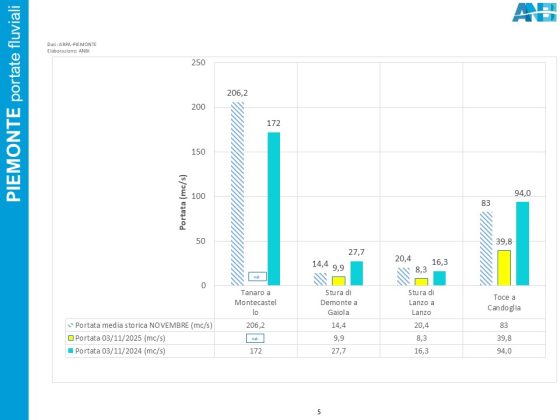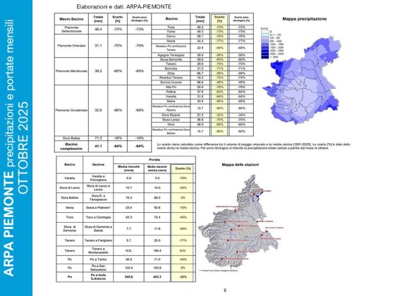 In Piemonte l’inizio dell’anno idrologico è stato all’insegna della discontinuità con quello precedente: dopo un’annata 2024-2025, che si è chiusa con un + 20% d’acqua, il mese di ottobre ha segnato un significativo deficit di precipitazioni (-64% con punte dell’84% sul bacino Residuo Po – Confluenza Dora Riparia e dell’82% su Residuo Po-confluenza Dora Baltea) ed una perdita dell’81% nell’indice SWE (Snow Water Equivalent) nel Piemonte meridionale. In crescita, ma deficitarie sono le portate dei fiumi Stura di Lanzo, Stura di Demonte e Toce.