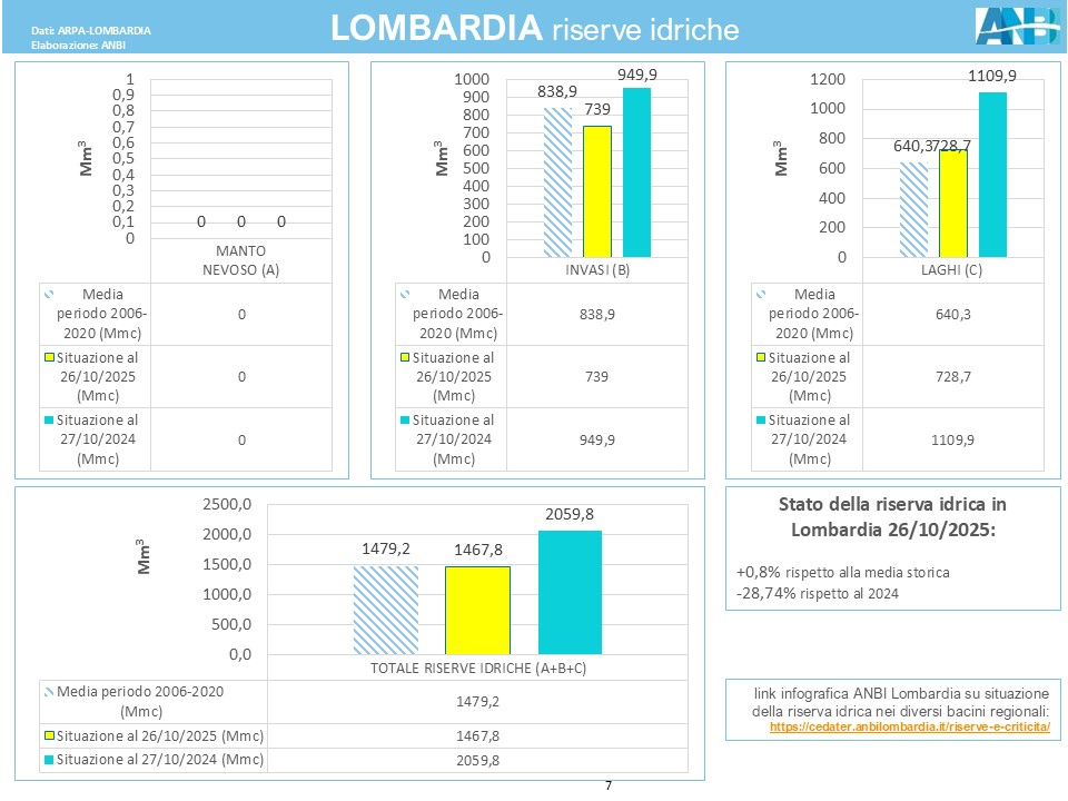 In Lombardia, le riserve idriche si stanno attualmente riducendo poco al di sotto della media storica e registrano un gap considerevole nel confronto con il 2024 (-28,74%).