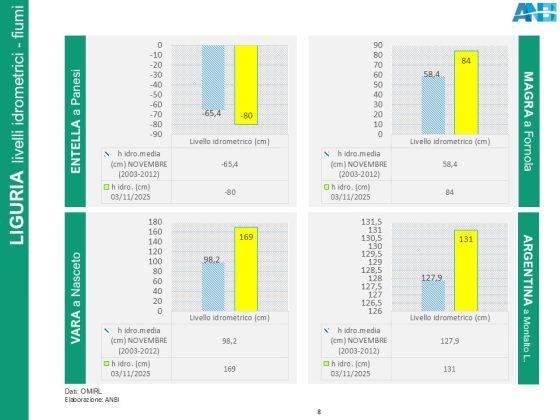 In Liguria, abbondanti piogge hanno interessato il Levante con conseguente crescita dei livelli idrometrici dei fiumi Magra, Vara ed Entella.