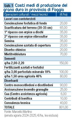 Considerando rese medie di 20-25 q/ha, i prezzi attuali impediscono di recuperare anche solo i costi di produzione, osserva Martino. «Il nostro è un grano duro straordinario, che merita ben di più delle attuali misere quotazioni della borsa merci di Foggia! Ci penalizzano prezzi troppo bassi e costi che, adottando una tecnica colturale ordinaria, si attestano su 800-900 €/ha, ma possono salire fino a 1.100-1.200 €/ha nel caso di un’annata piovosa, con precipitazioni abbondanti soprattutto nel periodo primaverile (tab. 1). Infatti piogge regolari consentono di effettuare una seconda concimazione azotata in copertura e, a volte, persino una terza concimazione azotata, e determinano la necessità di effettuare anche un secondo intervento anticrittogamico, con un conseguente aumento dei costi, che però non vengono compensati da un corrispondente aumento di rese».